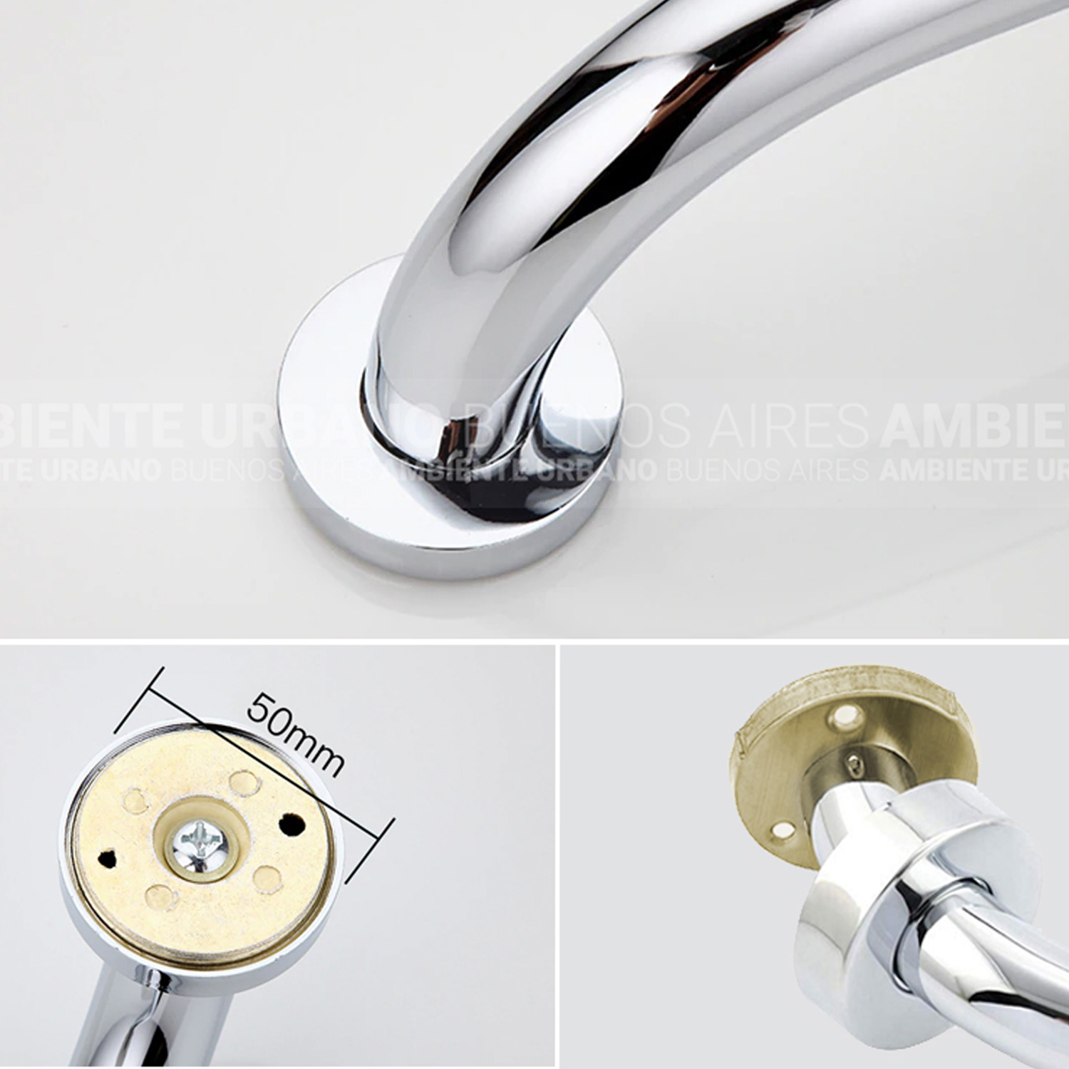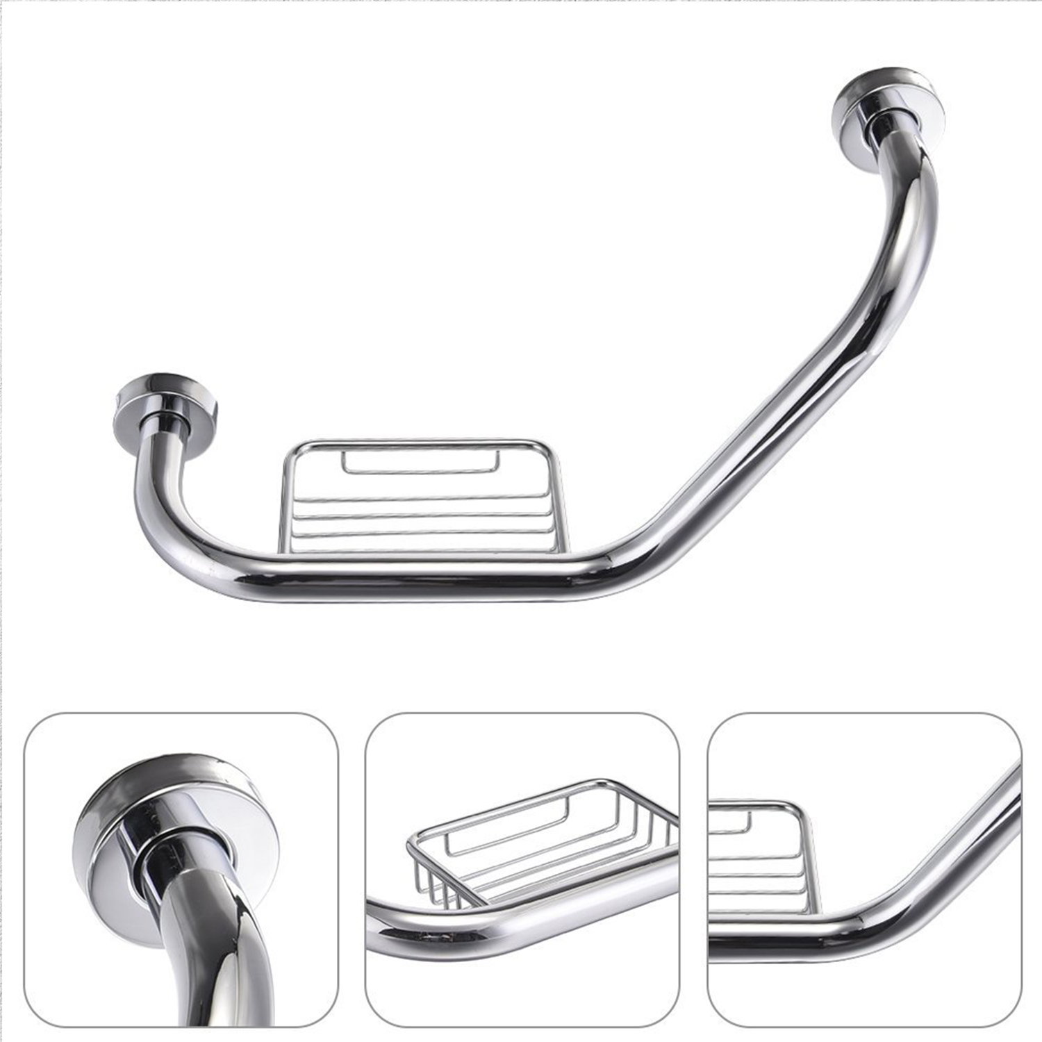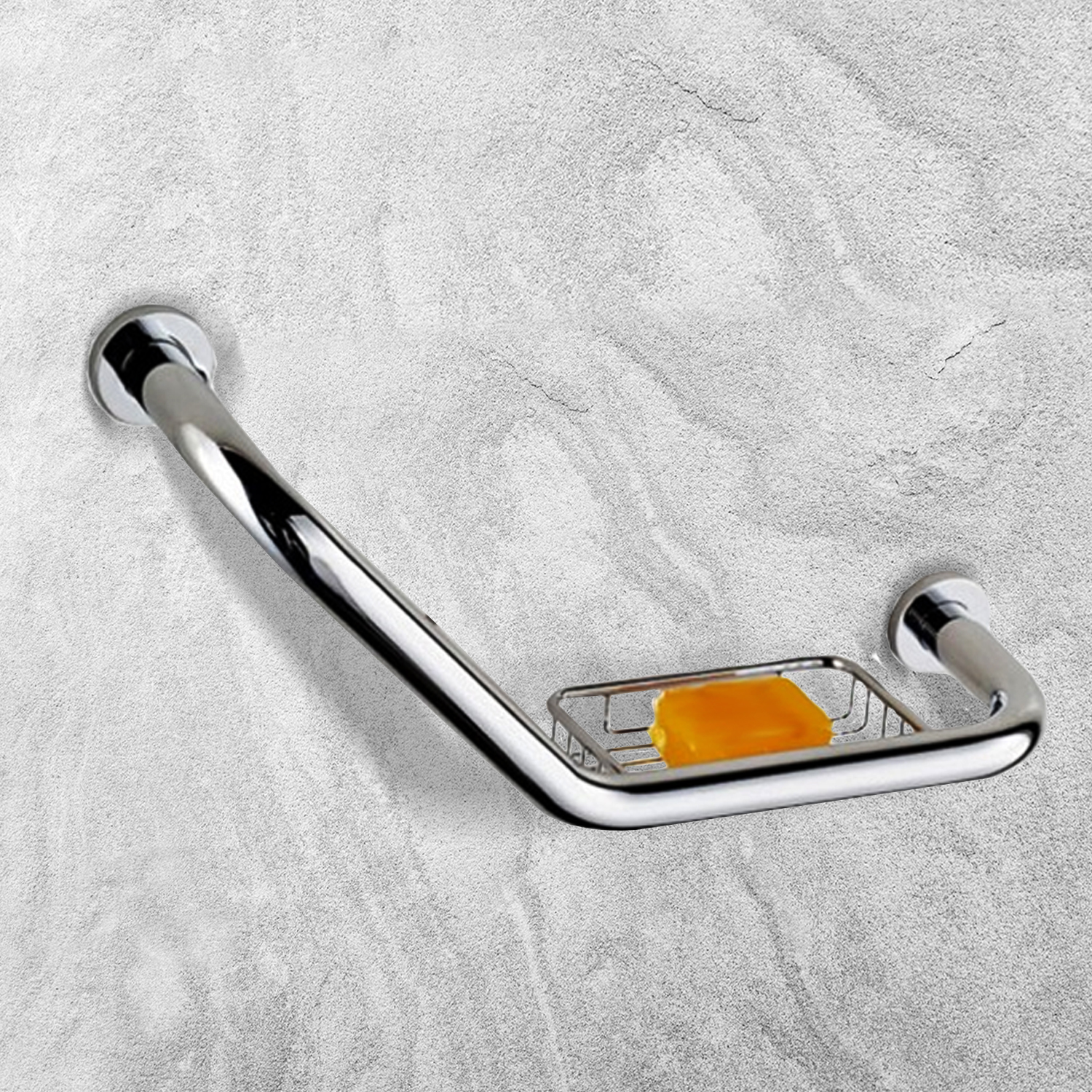 Barral agarradera angular de seguridad para bañeras c/Jabonera. Hecha en Acero inoxidable 304 – Cromado. Protección para baños y bañeras. Modelo con Jabonera.