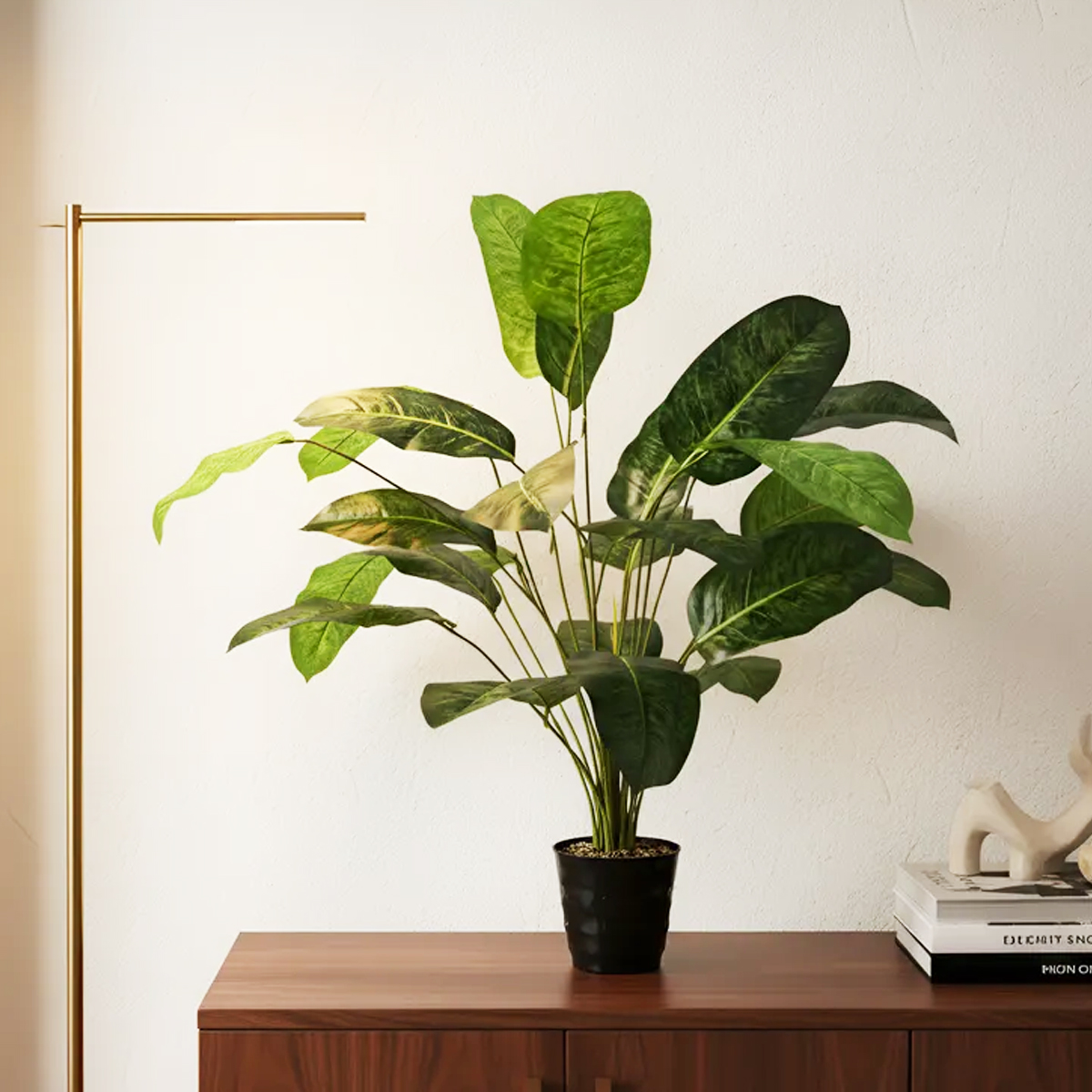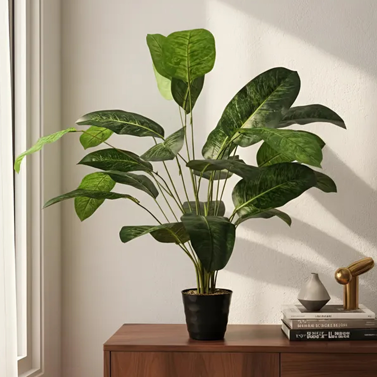 Dale un toque natural y elegante a tus espacios con esta planta artificial. Su diseño realista, con hojas en diferentes tonos de verde y acabados detallados, la convierte en una pieza ideal para ambientar tu hogar u oficina sin necesidad de cuidados especiales. Viene en una maceta negra con piedras decorativas que aportan un acabado moderno y sofisticado, lista para colocar en cualquier rincón: sobre mesas, escritorios, estantes o recibidores.