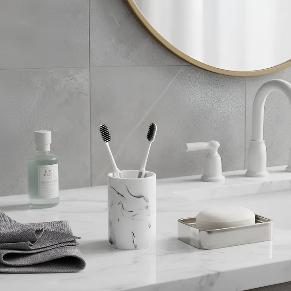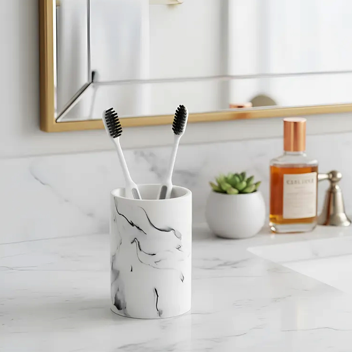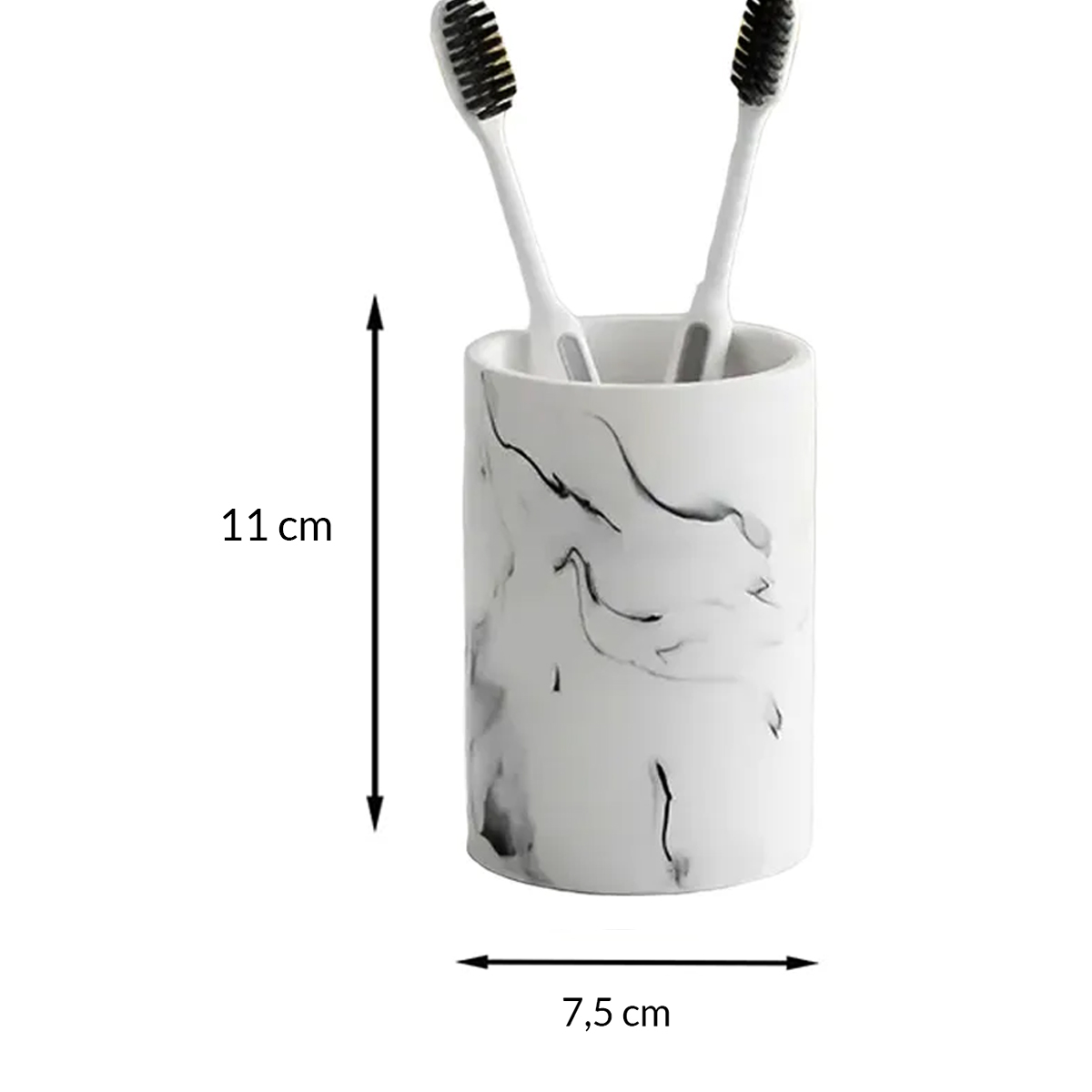 Vaso porta cepillo de resina símil mármol blanco cilíndrico. Todo el estilo que necesitas para tu baño en este set. Resistente y combinable con todos los ambientes. Moderno en resina blanca con textura marmolada. Material resistente, aporta belleza y ayuda a mantener el orden en tu baño.